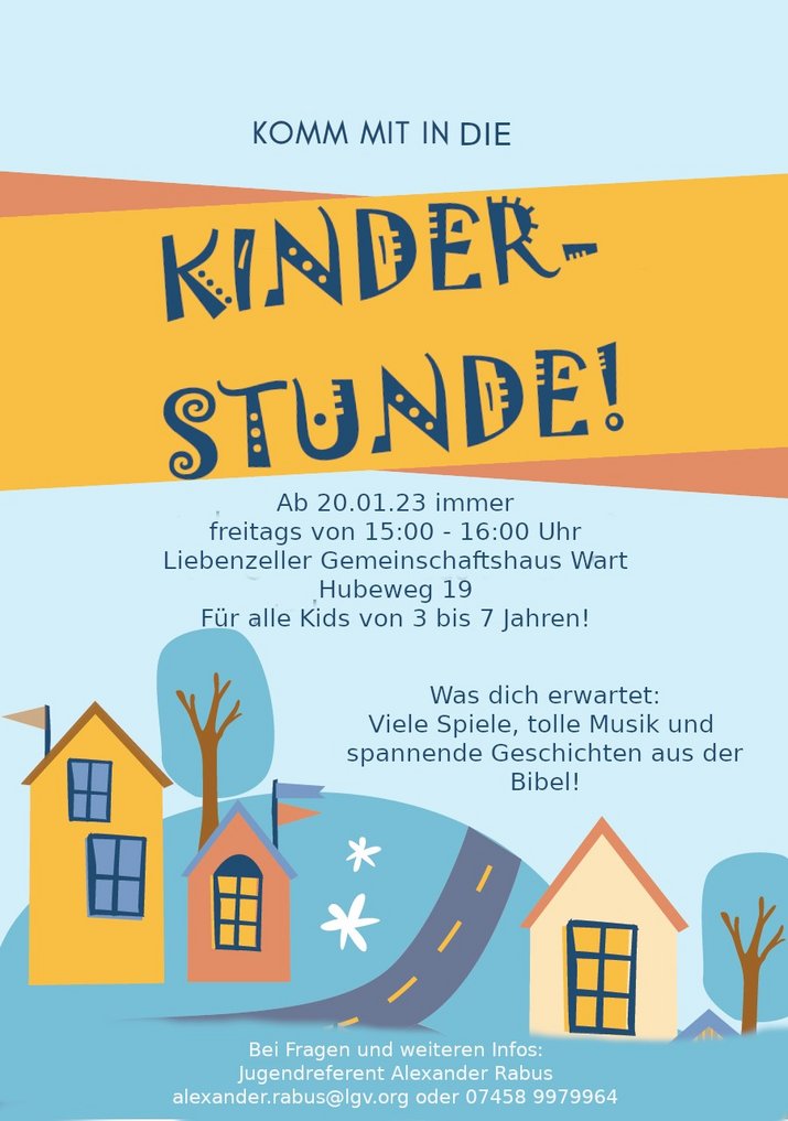 Wenn du zwischen 3 und 7 Jahre alt bist, dann bist du in der Kinderstunde genau richtig! Was erwartet dich bei uns? Viele Spiele, Lieder, basteln, Geschichten aus der Bibel. Wie du siehst, wird es bestimmt nicht langweilig! Also komm gerne vorbei.