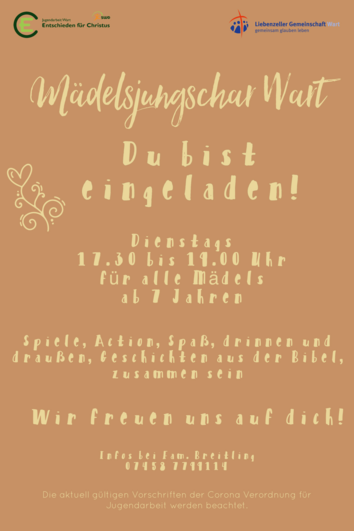 Herzlich eingeladen sind alle Mädchen im Alter von 7 bis 13 Jahren. Bei uns gibt’s jede Menge Action, coole Geschichten aus der Bibel, super Gemeinschaft und immer wieder etwas ganz Besonderes. Wir freuen uns auf dich! Wir treffen uns dienstags von 17.30 – 19.00 Uhr.